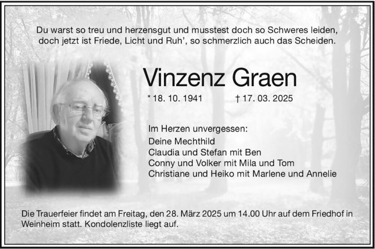 in dieser Zeit des Schmerzes wünschen wir Ihnen Kraft, den Verlust im Kreise Ihrer Liebsten zu verarbeiten. Als Zeichen unserer Anteilnahme und des Gedenkens entzünden wir dieses erste Licht. Möge diese Gedenkseite Ihnen helfen, Erinnerungen zu teilen und so das Andenken gemeinsam wachzuhalten.